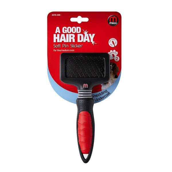 The Mikki Soft Pin Slicker has a curved back for a natural grooming action enabling the specially shaped slicker wire pins to work effectively.