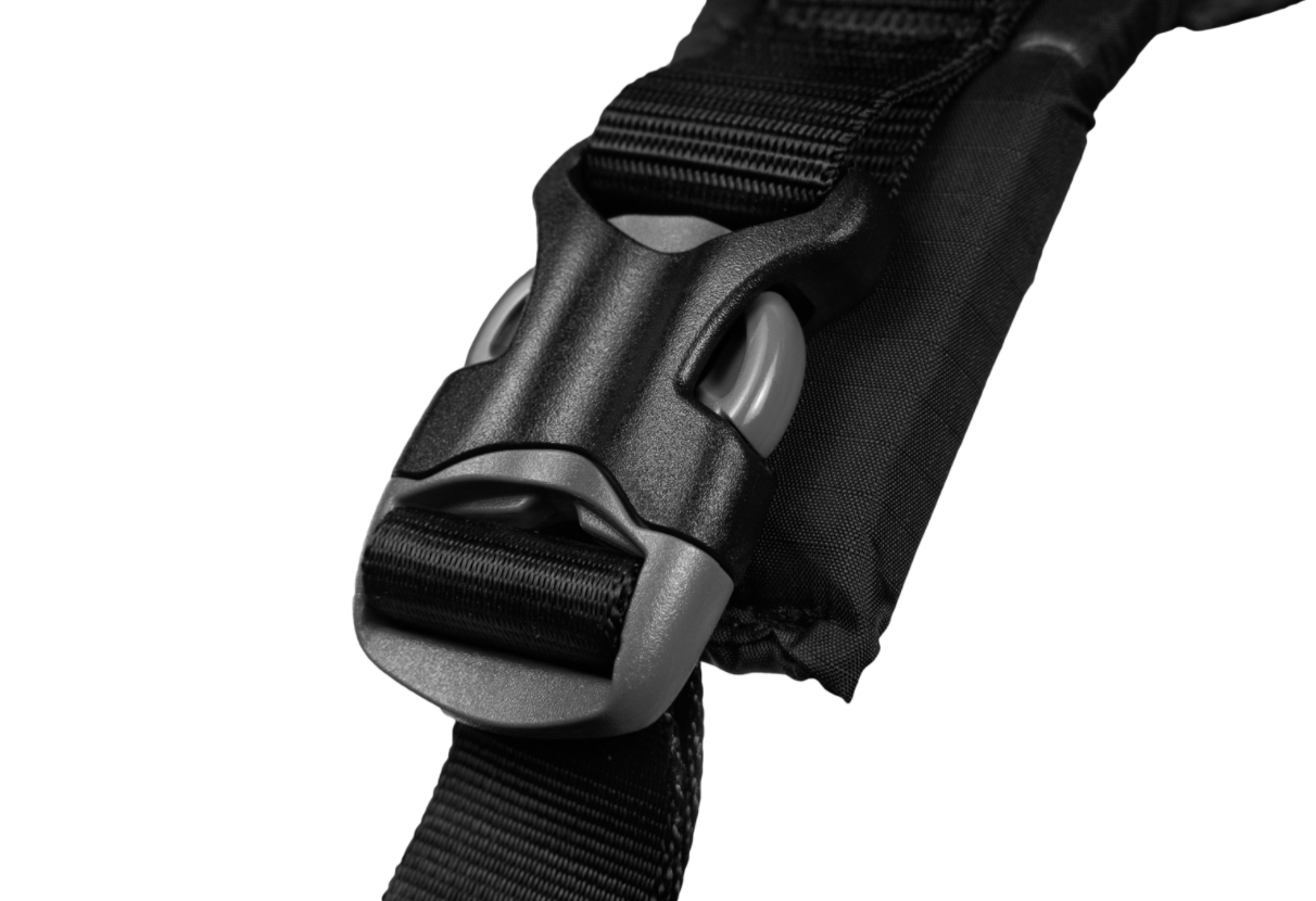 Line harness 5.0 is adjustable around the chest. After the initial adjustment, it is easy to put the harness on and take it off by opening the solid Duraflex® buckles on each side. Lock the chest straps by simply threading the end of the strap back through the sliplock.